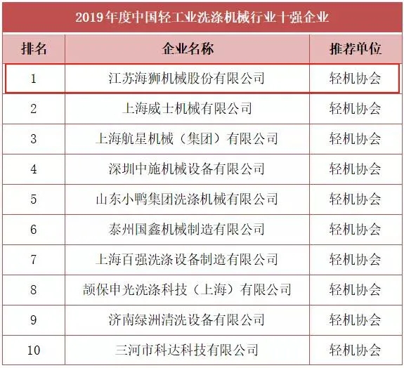 由中國輕工機械協(xié)會推薦,與中國輕工業(yè)聯(lián)合會共同評選出2019年度中國輕工業(yè)洗滌機械行業(yè)十強企業(yè),海獅機械排名第1位。