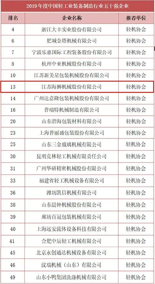 由中國輕工機械協(xié)會推薦的有22家企業(yè)榮登2019年度中國輕工業(yè)裝備制造行業(yè)五十強榜單,海獅機械排名第13位。